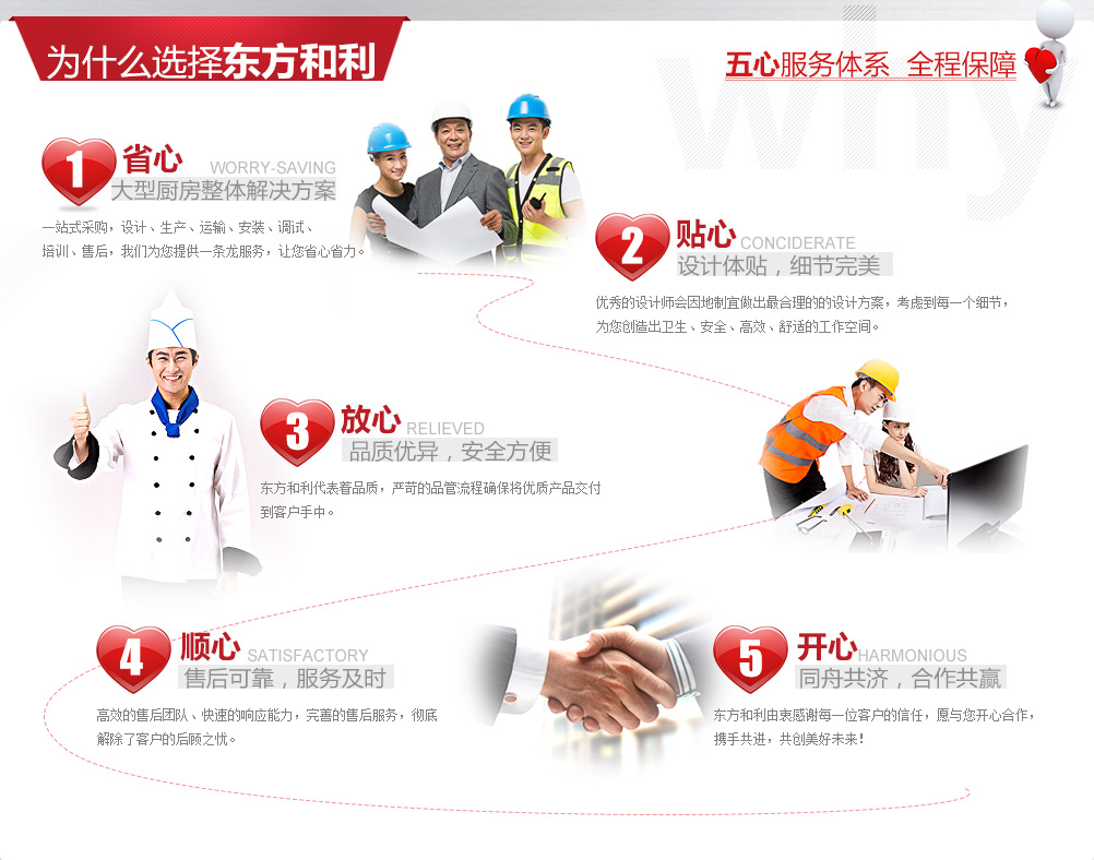 廚房工程建設(shè)是一項(xiàng)龐大復(fù)雜的系統(tǒng)工程,既需要與后勤工作人員、廚師溝通協(xié)調(diào), 又要與土建、裝修、機(jī)電、暖通等工程人員相互配合,工作量十分巨大。同時(shí)還要采購(gòu)眾多的食品機(jī)械、工具,這對(duì)沒(méi)有相關(guān)經(jīng)驗(yàn)的我們來(lái)說(shuō)確實(shí)是一個(gè)挑戰(zhàn)。有時(shí)候我們面對(duì)廚師提出的長(zhǎng)長(zhǎng)的采購(gòu)需求清單就已經(jīng)眼花繚亂了。 幸好東方和利提供的是整體解決方案,從前期的設(shè)計(jì)咨詢到后期的安裝調(diào)試、從大型設(shè)備到餐具小件,包括各種食品機(jī)械,排煙通風(fēng),這些瑣碎事情都由東方和利來(lái)完成,為我們提供量身定制的解決方案。一站式采購(gòu)為我們節(jié)省了大量精力,而且所有廚具都由東方和利來(lái)保修,對(duì)我們來(lái)說(shuō)也更加方便。總之,東方和利的服務(wù)讓我們非常省心,我很滿意。